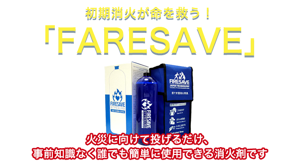 ファイヤーセーブは火災に向けて投げるだけ、事前知識なく誰でも簡単に使用できる消火剤です。 寒い場所(-20℃)でも凍結することはありませんので、日本全域で安心してご利用いただけます。 食品添加物が主原料なので、一般家庭でも人の集まる場所でも安全に保管・使用いただけます。